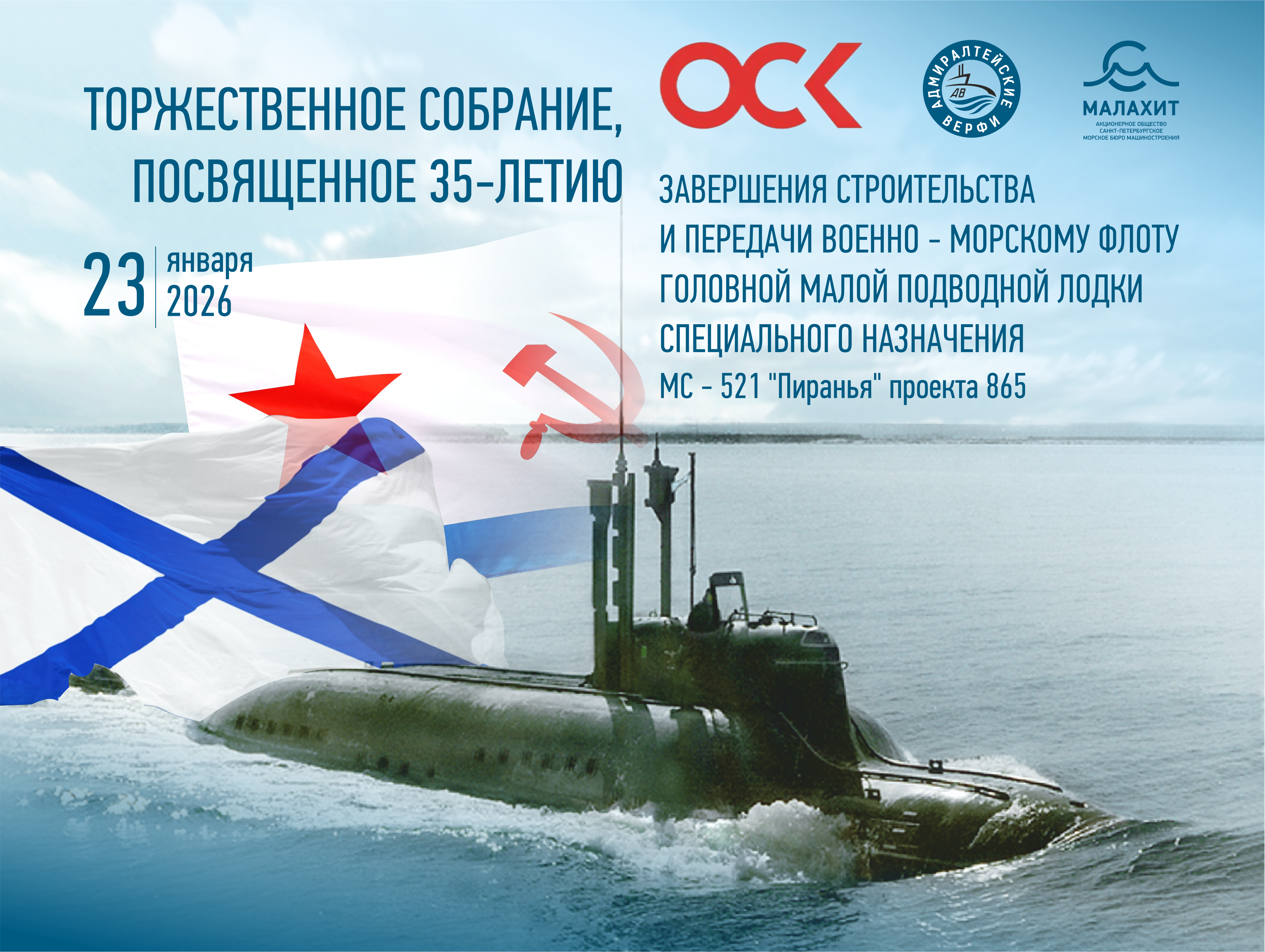 На предприятии ОСК Адмиралтейские верфи состоялось торжественное собрание, посвящённое 35-летию завершения строительства и передачи Военно-Морскому Флоту головной малой подводной лодки специального назначения проекта 865. Уникальный корабль создавался в Санкт-Петербургском морском бюро машиностроения «Малахит».