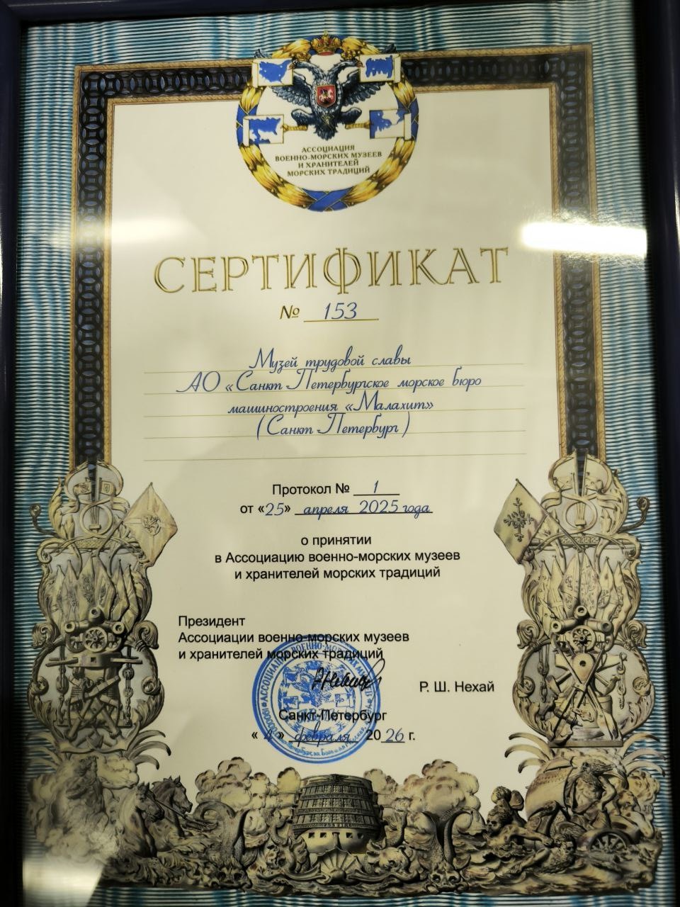 5 февраля 2026Сертификаты о вступлении новым членам торжественно вручили в завершении первого дня XII Коллегии музеев военно-морской направленности Российской Федерации, которая проходит с 4 по 6 февраля в Северной столице. Участие в мероприятии приняли представители Санкт-Петербургского морского бюро машиностроения «Малахит».
